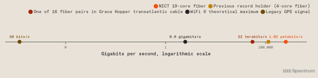 Earlier this year, a team from the National Institute of Information and Communications Technology and Sumitomo Electric, in Japan, blasted a record 1.02 million billion bits (petabits) across 1,808 kilometers in one second, or 1.86 exabits per second-kilometer. At that rate, in one second, you could send everything everyone in the world watched on Netflix in the first half of this year from Tokyo to Shanghai 4,000 times. A special 19-core optical fiber made it possible.