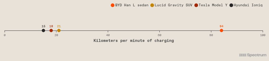 The Chinese automaker BYD used a new fast-charging system that peaked at 1,002 kilowatts and added 421 kilometers of range to a Han L sedan in under five minutes. That’s about 84 kilometers per minute. Among the key innovations behind the feat: 1,500-volt silicon carbide transistors and lithium iron phosphate batteries with half the internal resistance of their predecessors.