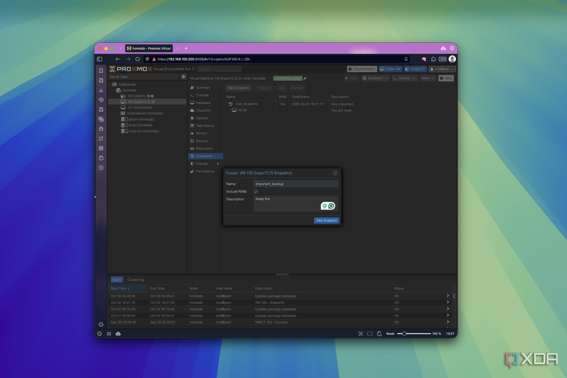 Proxmox makes this incredibly easy. Each VM and container has a Snapshots tab in the Proxmox UI, and all you need to do is head there and click Take Snapshot to create a snapshot of the VM. You can name each snapshot and add a description in case you need to identify it more easily later, and also choose to include RAM in the snapshot or not. When you need to restore a snapshot, heading into the same tab gives you a Rollback button so you can easily revert that machine to the selected state.