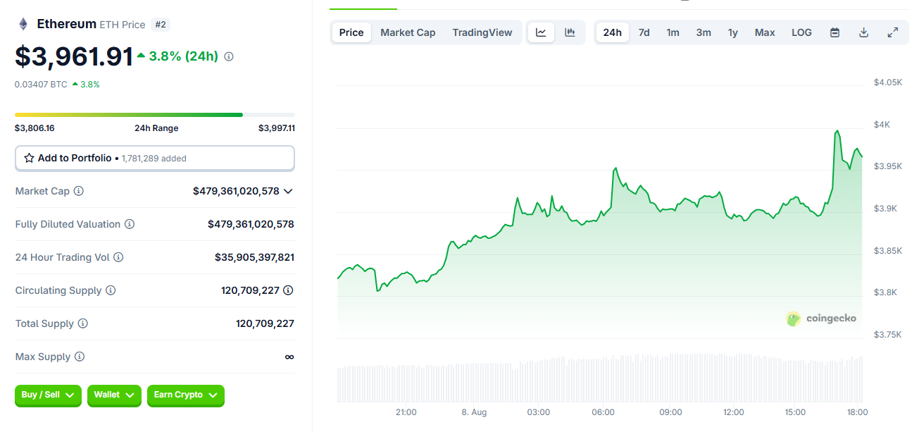 ETH is up over 62% in the past three months, with the biggest climb kicking off in July. The token rose to $4,001.13 on Gate.io, with nearly every transaction hovering around the $4,000 mark. BinancedataETH’s price momentarily exceeded $4,012.