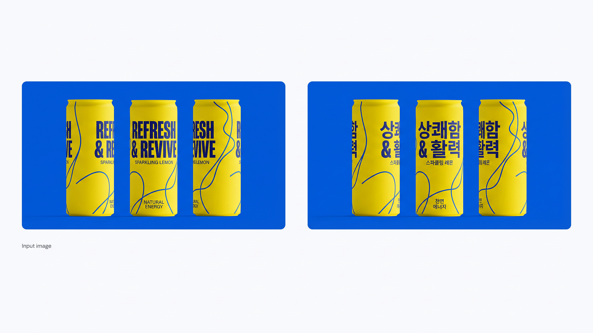 Elsewhere, Gemini creates an energy drink brand, writing the text on the can in English. Then, using the prompt: “translate all the English text on the three yellow and blue cans into Korean, while keeping everything else the same,” the cans transformed, keeping the text in the same place, now simply translated.